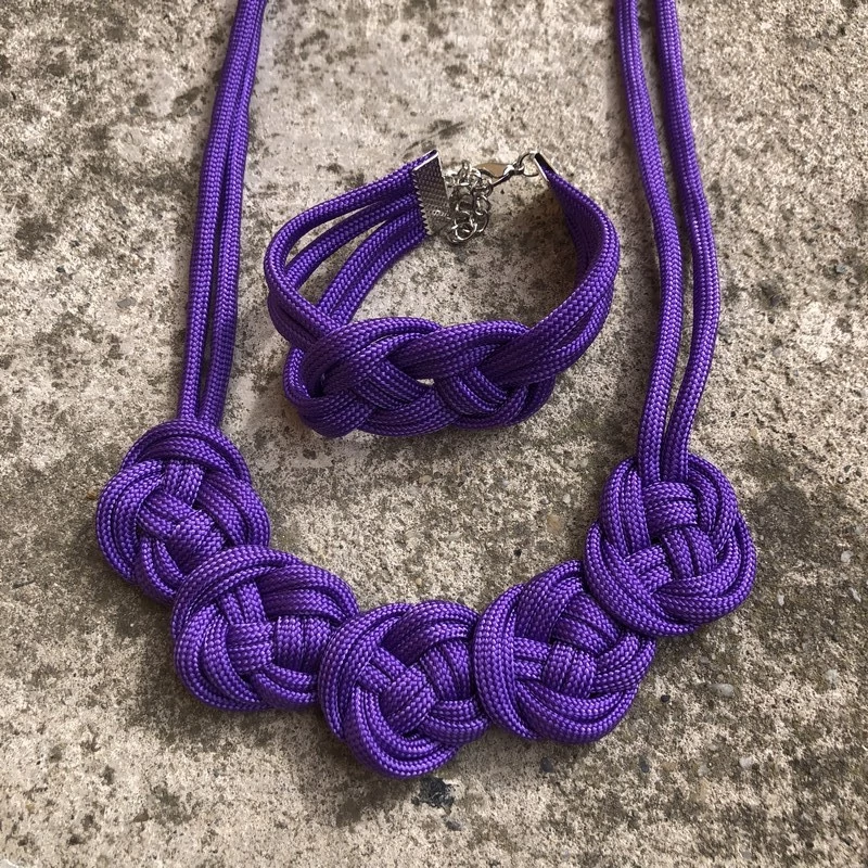 Egyedi, paracord zsinórból készült csomózott nyakláncból és csomózott karkötőből álló ékszer szett.