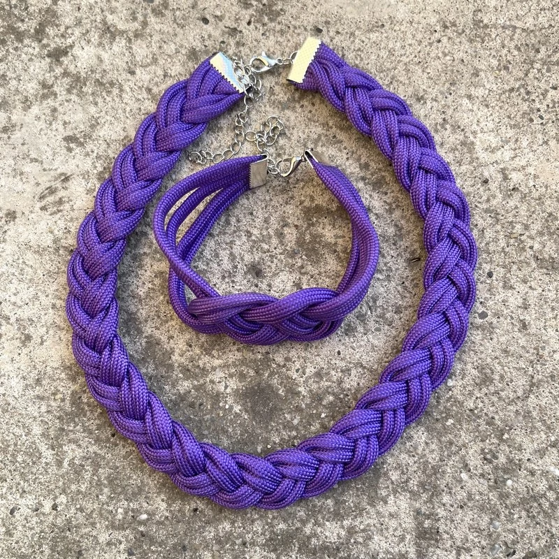 Egyedi, paracord zsinórból készült fonott nyakláncból és csomózott karkötőből álló ékszer szett.