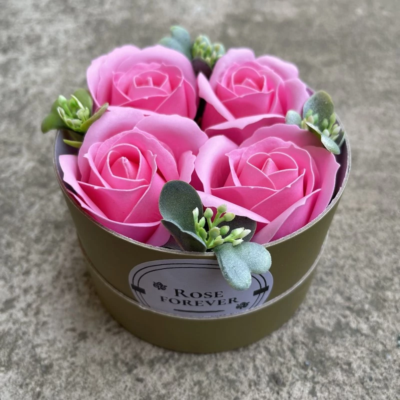 Világos pink szappanrózsák, kör alapú, olívazöld rózsaboxban