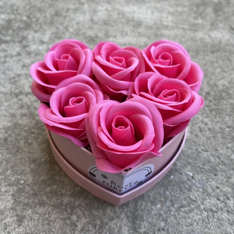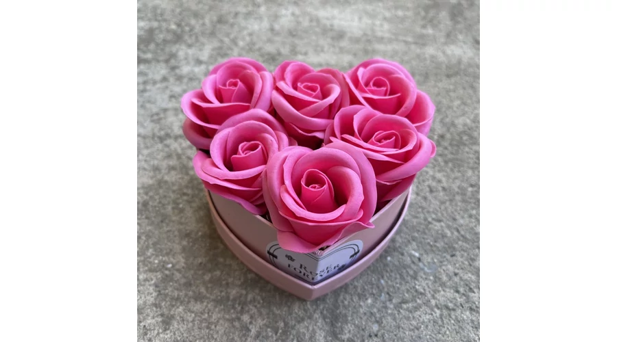 Sötét pink szappanrózsák, szív alakú, rózsaszín rózsaboxban