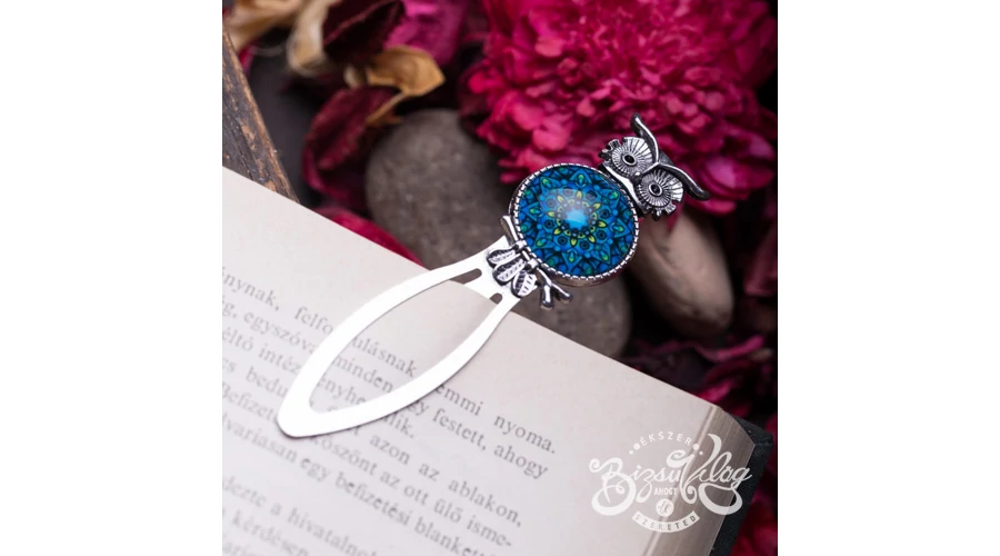 Fémötvözetből készült üveglencsés, csíptetős könyvjelző, egyedi készítésű, kézműves ajándéktárgy.