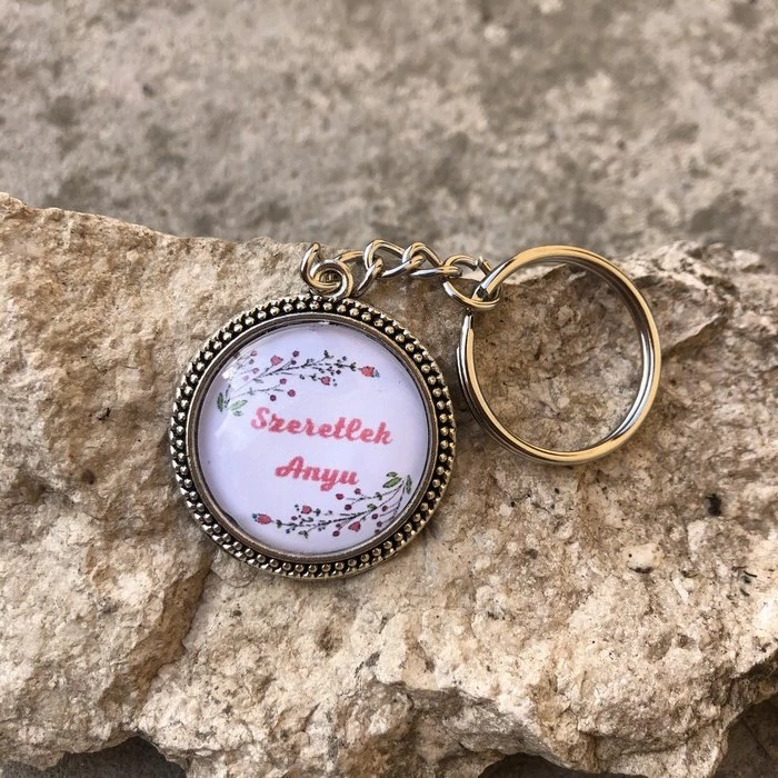 Fémötvözetből készült üveglencsés, kézműves kulcstartó, egyedi készítésű, kézműves ajándéktárgy, tökéletes ajándék Anyák napjára.