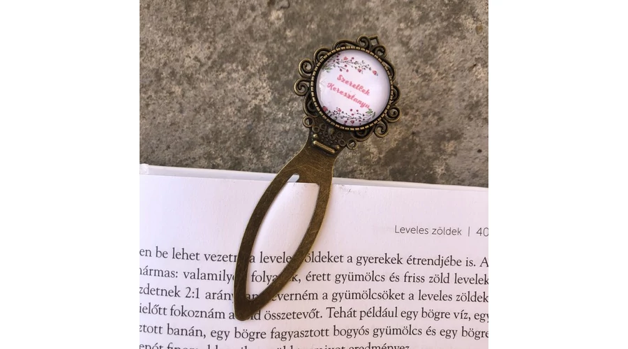 Fémötvözetből készült üveglencsés, csíptetős könyvjelző, egyedi készítésű, kézműves ajándéktárgy, tökéletes ajándék Anyák napjára.