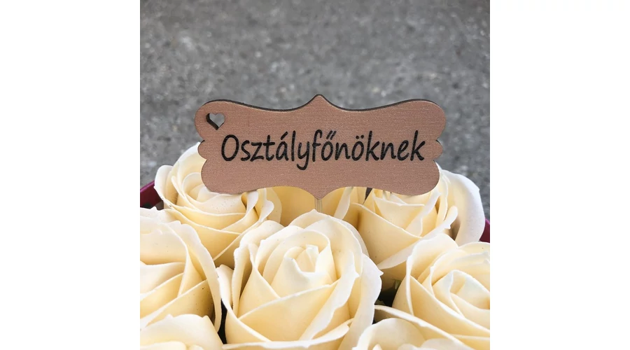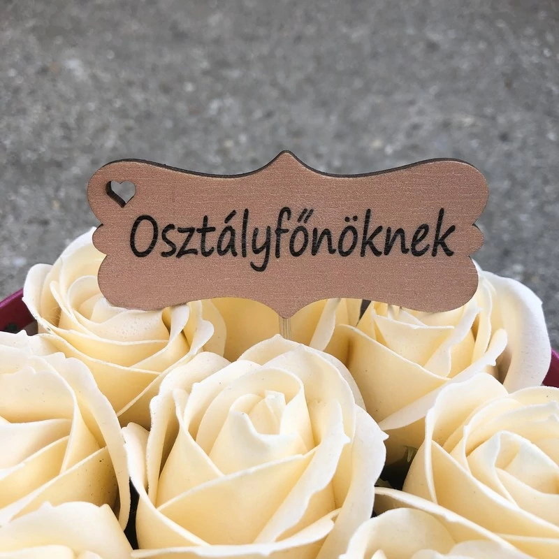 Egyedi, lézervágott felirat, mellyel kiegészítheti az ajándékát! A felirat hurkapálcára van ragasztva, azzal könnyen oda szúrható, ahol Önnek a legjobban tetszik!