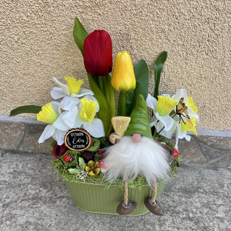 Saját készítésű tavaszi asztali dísz. Minden része szárított termésekből és exkluzív minőségű selyemvirágokból készült, így évekig az otthon dísze lehet!