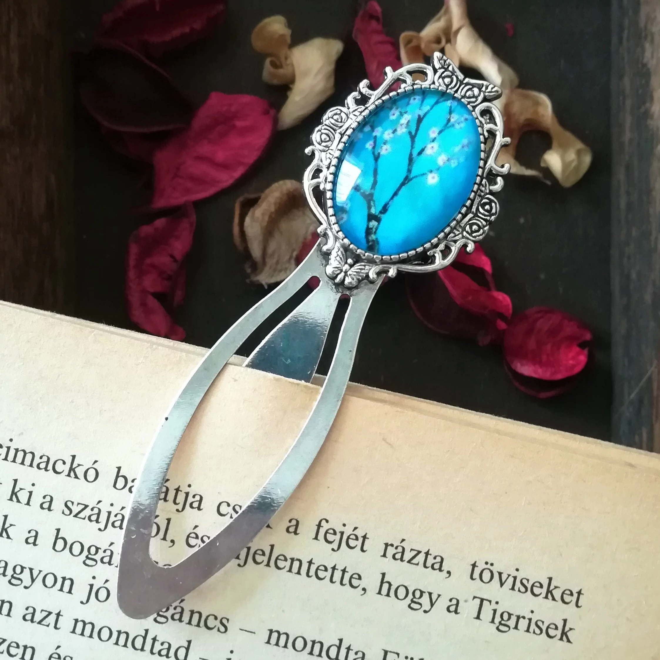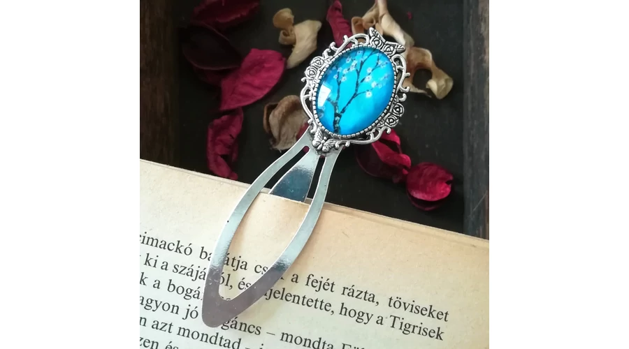 Fémötvözetből készült üveglencsés, csíptetős könyvjelző, egyedi készítésű, kézműves ajándéktárgy.