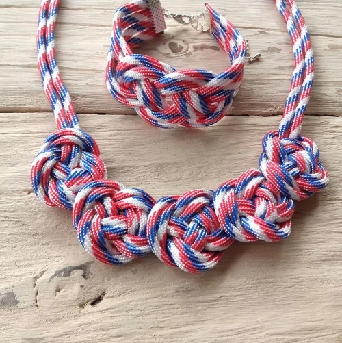 Egyedi, paracord zsinórból készült csomózott nyakláncból és csomózott karkötőből álló ékszer szett.