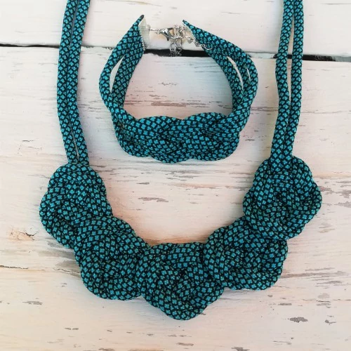 Egyedi, paracord zsinórból készült csomózott nyakláncból és csomózott karkötőből álló ékszer szett.