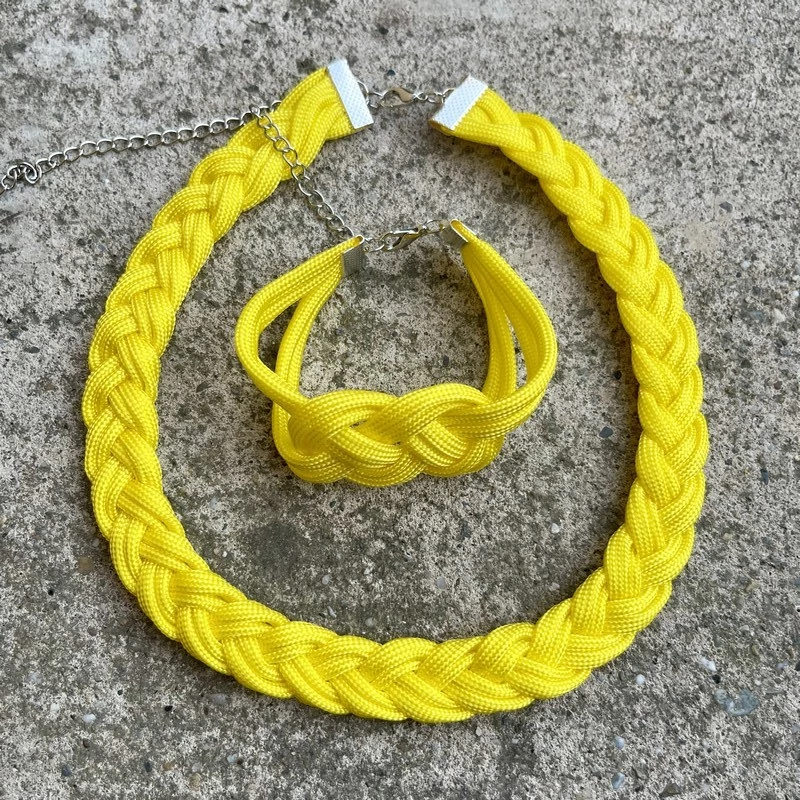 Egyedi, paracord zsinórból készült fonott nyakláncból és csomózott karkötőből álló ékszer szett.