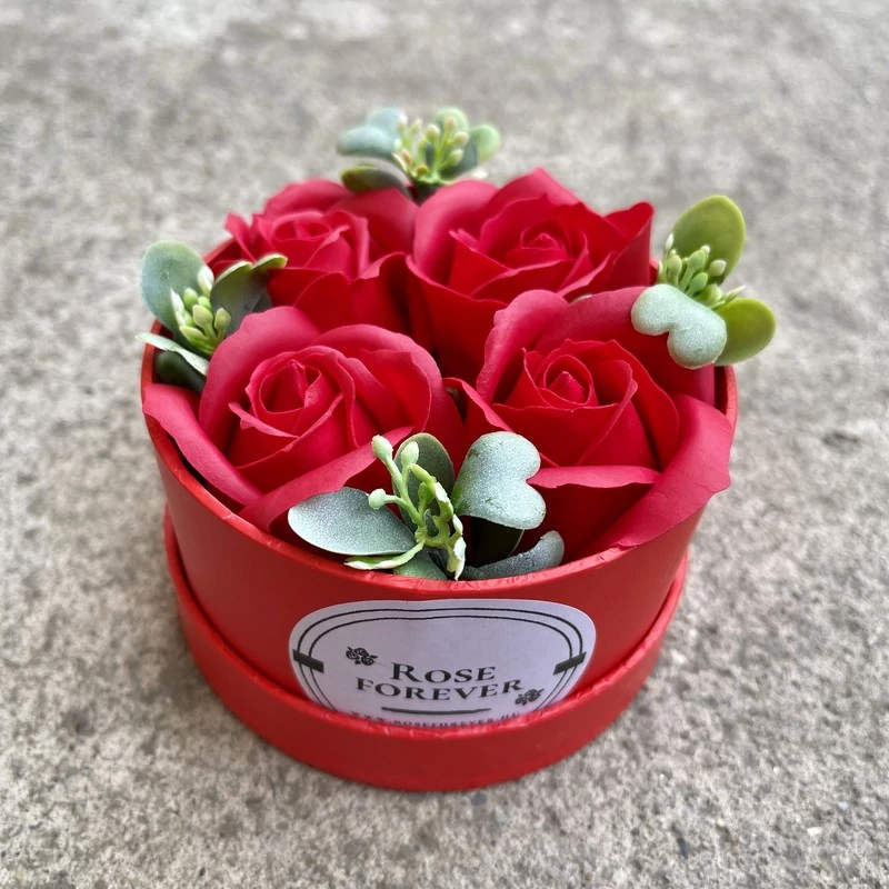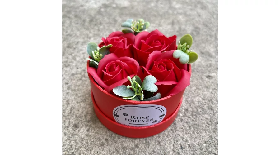Vörös szappanrózsák, kör alapú, piros rózsaboxban